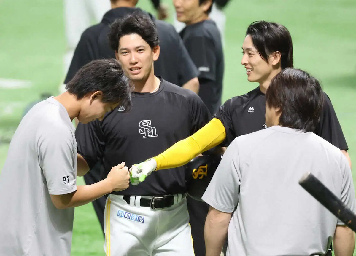 井上はこの日の試合前、打撃練習をしていた周東の元に駆け寄ると、何度も頭を下げ謝罪。周東は笑顔で謝罪を受け入れ、右拳をニコニコしながら差し出し、井上とグータッチを交わした。井上とともに古巣の後輩たちに声をかけた甲斐、そして栗原も加わり和やかなムードが広がり、厳しい表情を崩さなかった井上は少しだけホッとした表情を見せた。