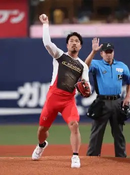 始球式は23年の阪神―ロッテ1回戦(甲子園)以来、2度目。競輪のユニホームを着用してマウンドに上がりノーバウンド投球を披露した。
