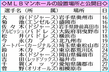大リーグ機構(MLB)は10日(日本時間11日)、日本選手12人のイラストがそれぞれ描かれたマンホールのふたを、各選手ゆかりの場所に設置すると発表した。