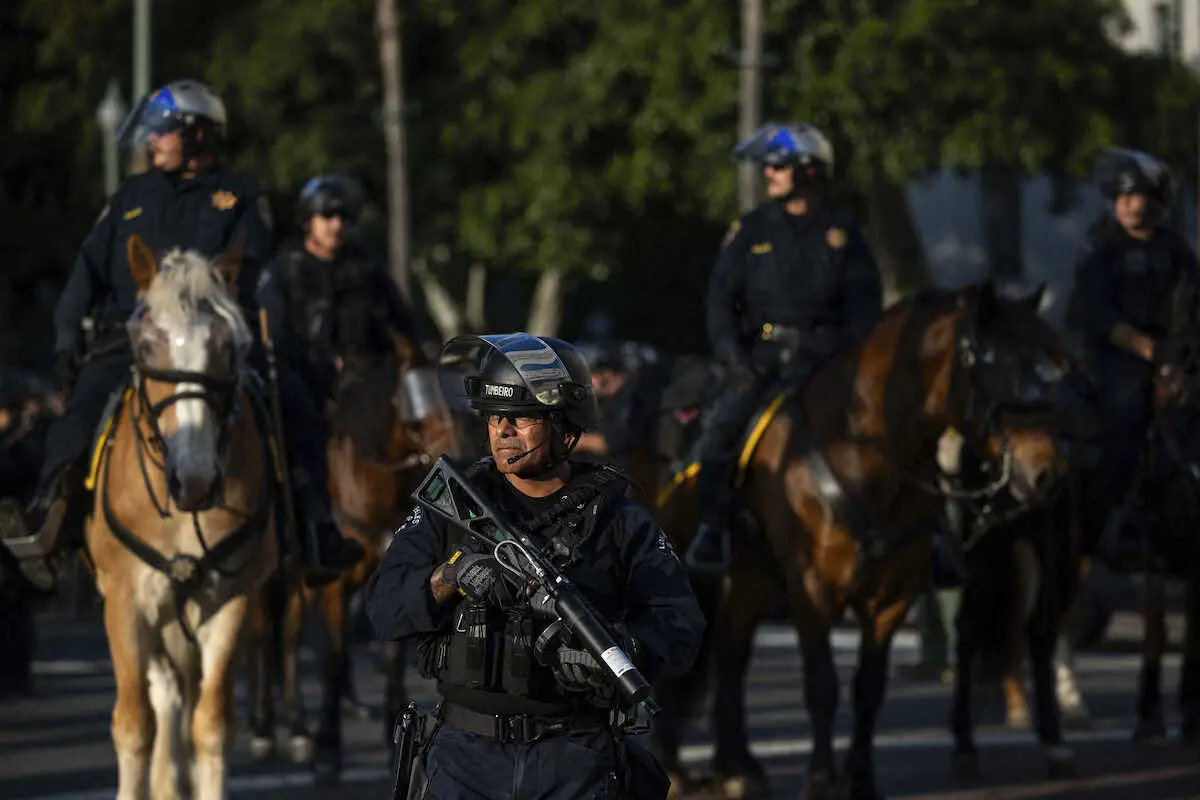 ロサンゼルスで連邦移民執行部の襲撃に対する抗議活動中、警察は市庁舎の外で抗議活動者と対峙した(AP)