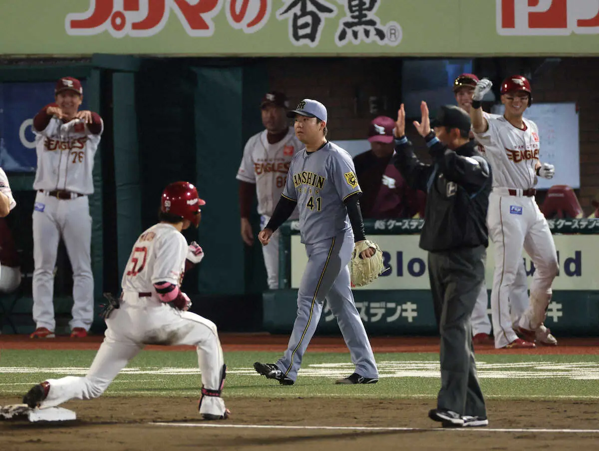 頼みの村上でも連敗を止められなかった。4回、先頭の浅村への四球をきっかけにして招いた1死満塁のピンチで、踏ん張りきれない。辰己に犠飛。武藤にはツーシームをはじき返され、右翼線に2点三塁打を浴びた。森下、大山の適時打で3回に挙げた2点リードを守り切れなかった。