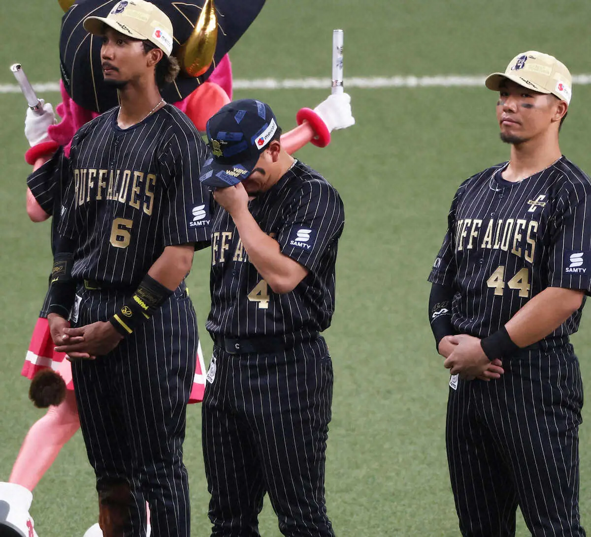 最後に、あふれる感情が湧き出した。「きょうは熱い声援をありがとうございました。大阪桐蔭のブラスバンドの人たちもありがとうございました。きょう始球式で…」と口にしたところで、涙が止まらず。「大翔が投げたんですけど、僕たちもシーズン最後まで負けない気持ちで頑張ります。大翔も頑張って下さい」と涙ながらに思いを伝え、京セラドームは盛大な拍手に包まれた。