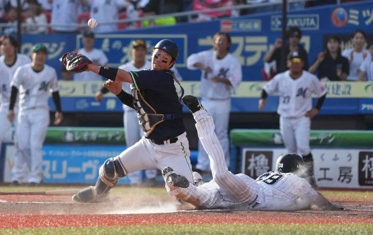 4―4の9回無死一塁からロッテ・愛斗の犠打に三塁からチャージをかけた北村、捕手・古賀、投手・清水、一塁・オスナが一かたまりに。結局捕犠打で1死は取ったが、一塁走者だったロッテ・高部の三塁進塁を簡単に許した。