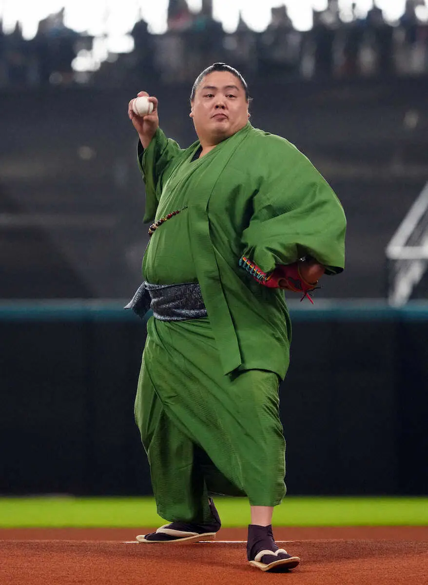 日本相撲協会とのコラボデーで、北海道岩内町出身の幕内・一山本がファーストピッチに登場した。