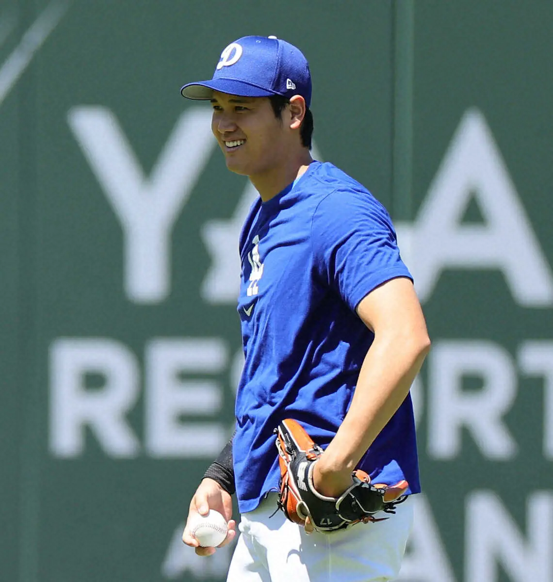 <ドジャース・ジャイアンツ>キャッチボールで笑顔の大谷(撮影・光山 貴大)