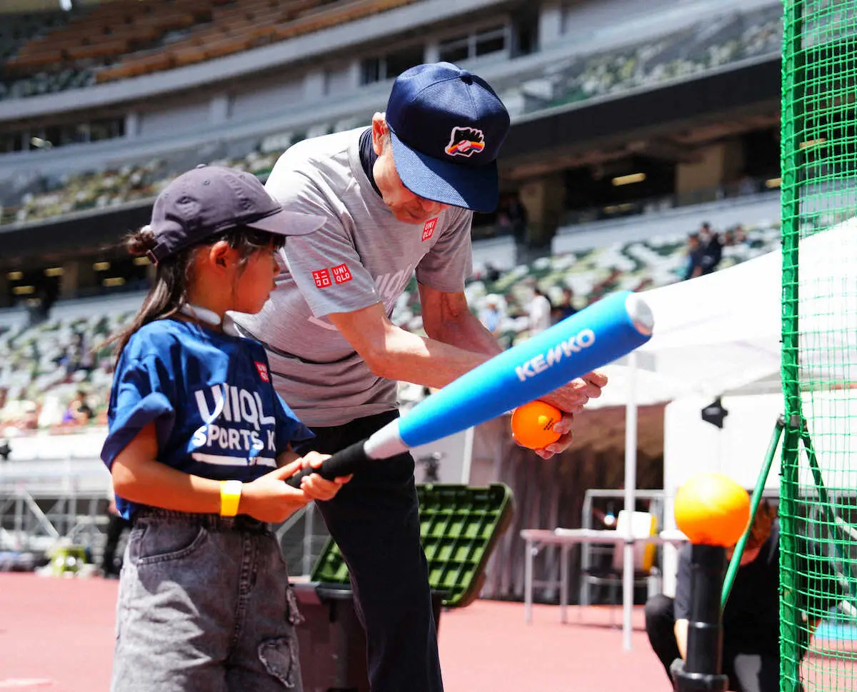 <JFAユニクロマルチスポーツキッズイベント>子どもに打撃を教える王貞治氏(撮影・大城 有生希)