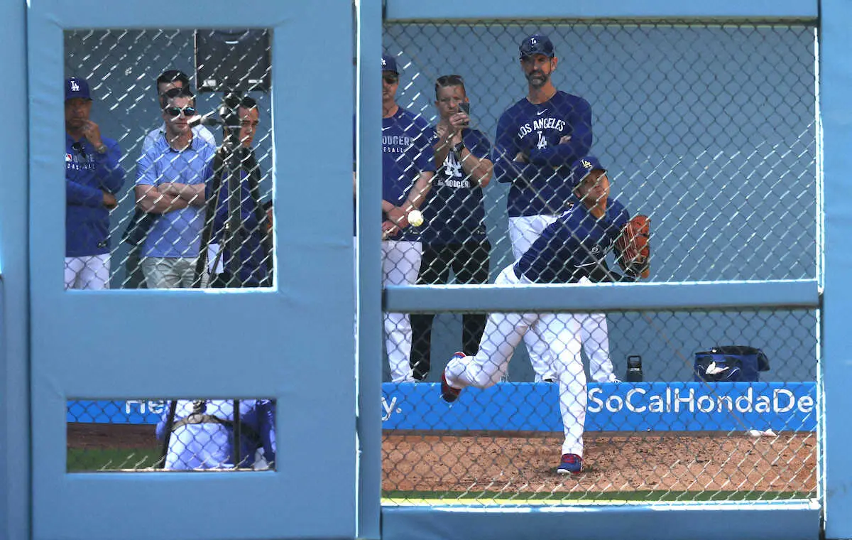 ロバーツ監督、フリードマン編成本部長、ゴームズGM、プライアー投手コーチが見守るなか、直球を多めに制球も大きく乱れることなく力強い球を投げ込んだ。