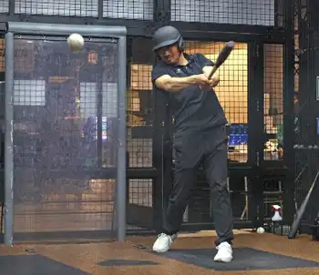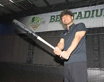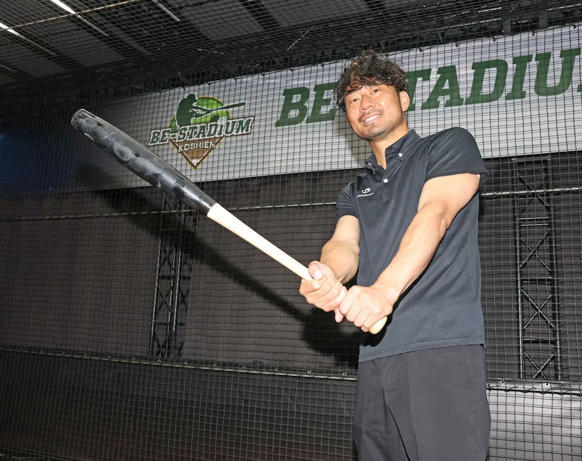 阪神OB・狩野恵輔氏が、22日、甲子園歴史館に併設されている「BE―STADIUM KOSHIEN」で、トルピード(魚雷)バットの試打を行った。
