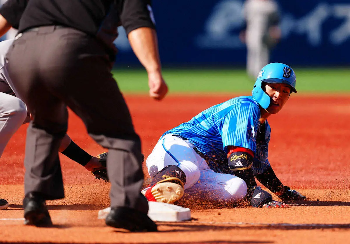二塁走者・京田が本塁を狙う間に三塁へ走り出した度会。中継プレーで遊撃・友杉が三塁に悪送球し、ボールが逸れる間に一気に本塁に生還し、この回3点を返した。