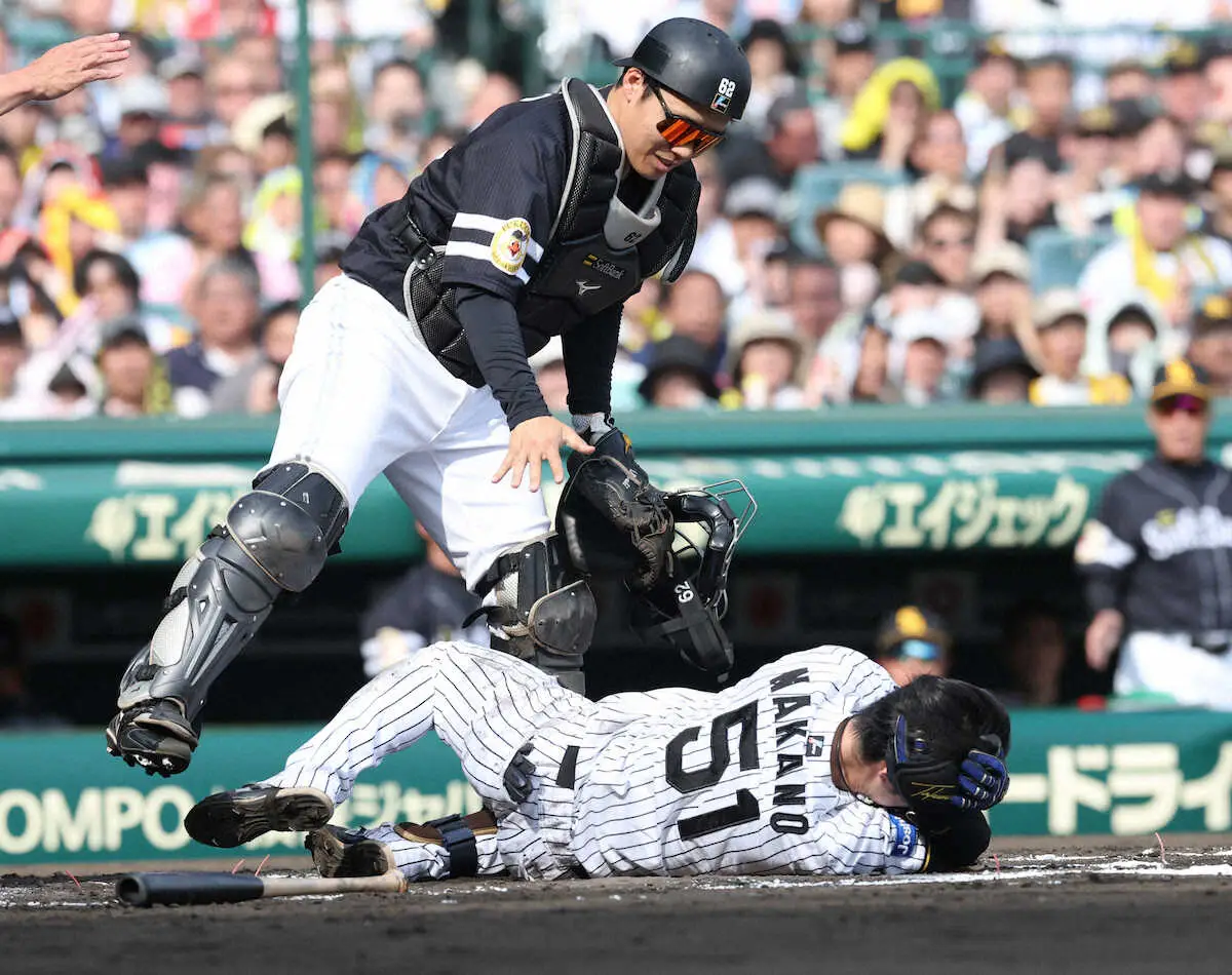 阪神・中野拓夢内野手が、ソフトバンク・津森宥紀投手から頭部死球を受けた。