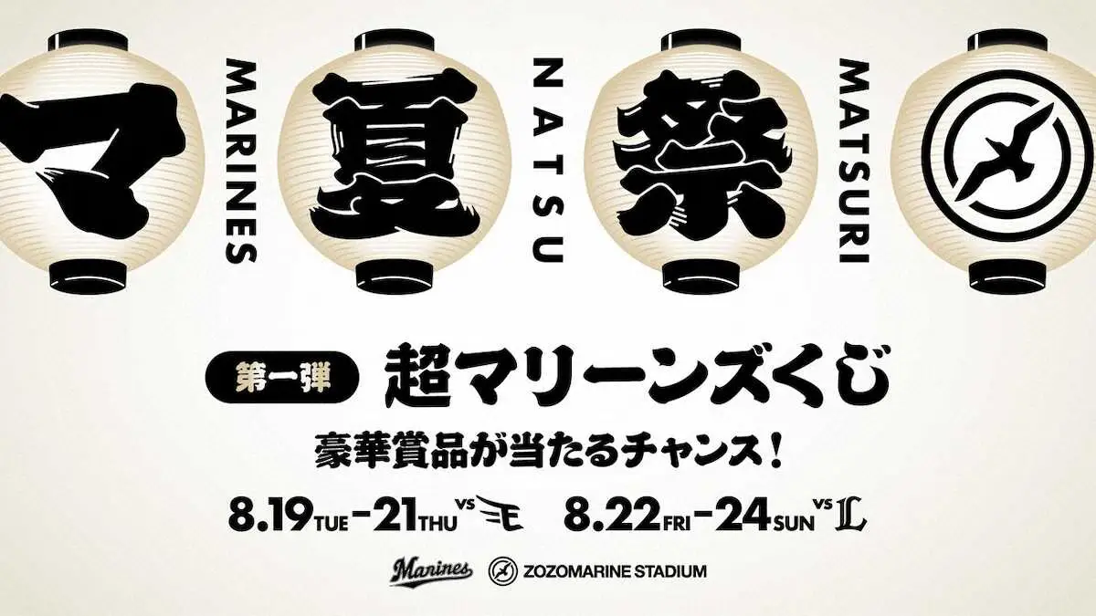 千葉ロッテマリーンズは8月19~21日の楽天戦、8月22~24日の西武戦(いずれもZOZOマリンスタジアム)の6試合を対象に「マリーンズ夏の運だめしフェス!」と題し、来場者に抽選で豪華景品が当たる「超マリーンズくじ」を開催すると発表した。