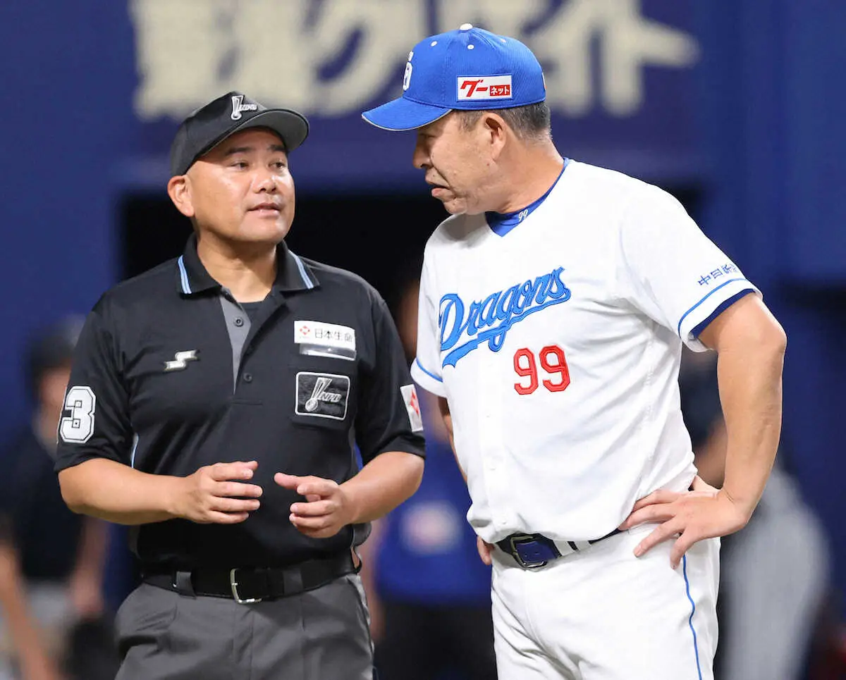 <中・広>尾田の本盗失敗についてリクエストも判定は変わらず、審判にコリジョンについて確認する井上監督(撮影・椎名 航)