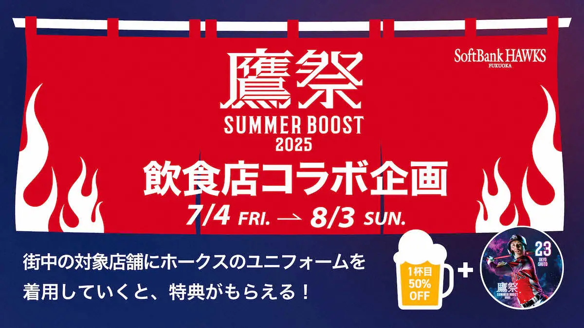 ソフトバンクでは夏のエンターテインメントイベントとして「鷹祭 SUMMER BOOST」を行う。今年は福岡市などの245店舗の飲食店とタッグを組み、期間中にホークスのユニホームを着用して来店すると、1杯目のドリンク半額と先着でオリジナルのコースターがプレゼントされる特典が提供される。