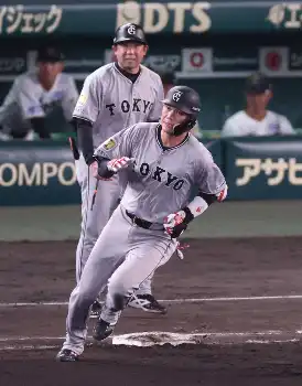 <神・巨>6回、適時二塁打を放ち、一塁を回る坂本(撮影・中辻 颯太)