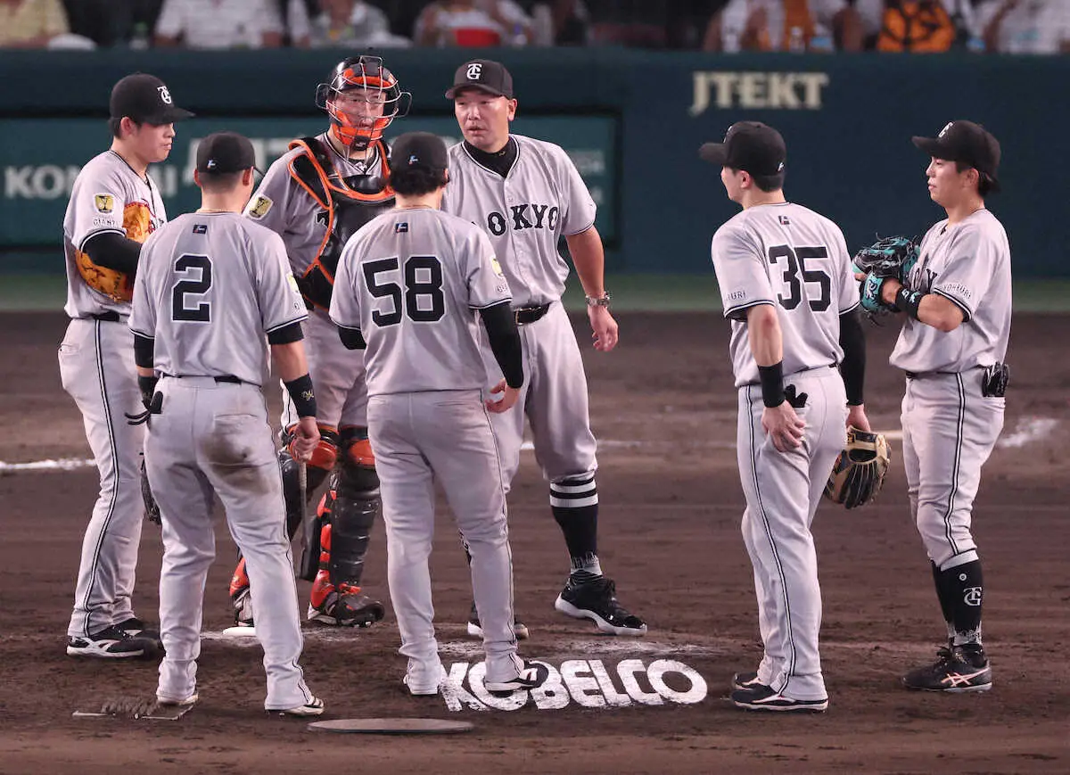 <神・巨>7回、マウンドでナインに声を掛ける阿部監督(中央)(撮影・中辻 颯太)