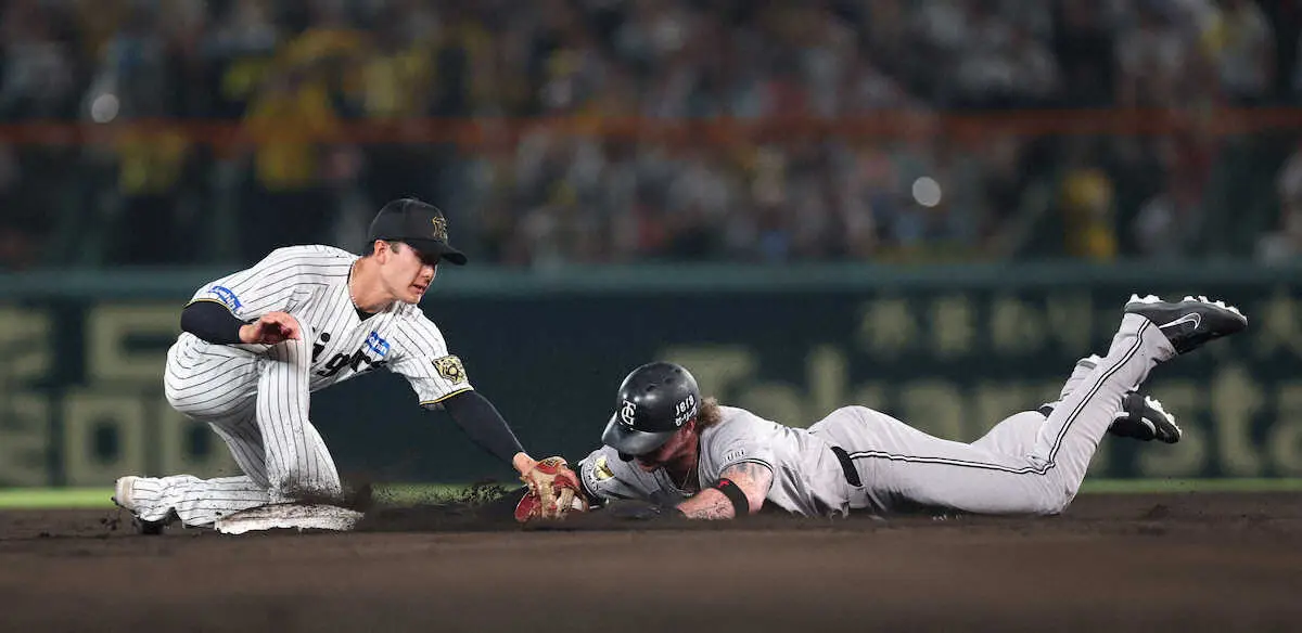 <神・巨>7回、右前打を放ち、二塁を狙うもアウトのキャベッジ(右) (撮影・平嶋 理子)