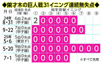 巨人戦は24年7月30日から6連勝。24年8月31日の2回から続いている同戦の連続イニング無失点も31に伸びた。