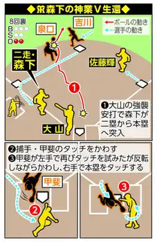 0―0の8回。2死から森下が奪った四球で、ドラマは幕を開けた。佐藤輝も四球で続き、大山は強烈な遊撃へのゴロ。これがイレギュラーし、泉口の体に当たり大きく跳ねた。この瞬間、田中三塁ベースコーチは森下に本塁突入を指示した。