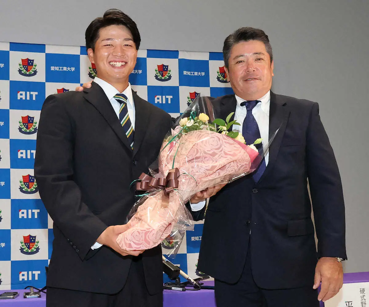 ヤクルトから1位指名され、平井監督(右)と笑顔で記念撮影する愛工大・中村(撮影・椎名 航)