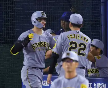 植田だ!熊谷だ!阪神は途中出場の両者が9回に連続タイムリー二塁打でダメ押し、ベンチも大盛り上がり