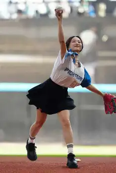 森はファイターズのユニホームと黒色のミニスカート姿で投球。ボールは大きく外れてしまい、がっくり。それでも投球後は笑顔を見せてセレモニーを楽しんでいた。
