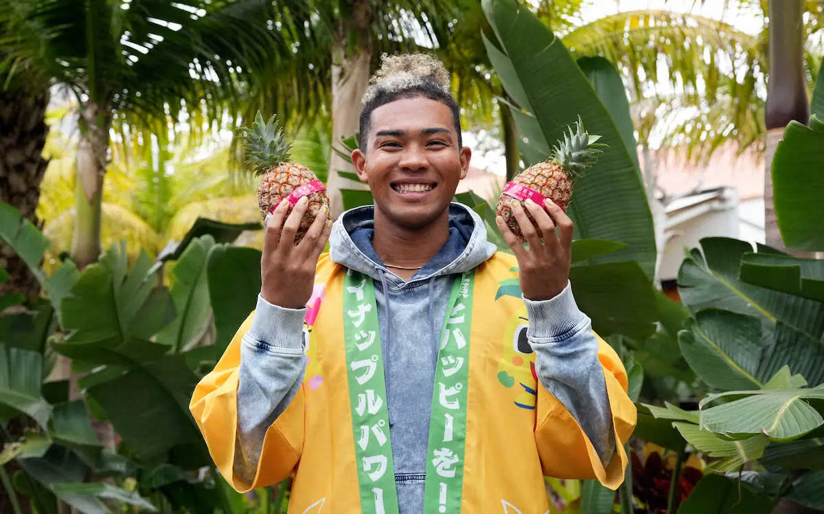 「いろいろ考えたんですけど、ご縁を頂いたので広めたいなと思って」。今年2月からナゴパイナップルパークのアンバサダーに就任。セミロングの金髪をゴムで縛り上げる独特な髪形が、パイナップルを連想させることが起用理由だった。この日は吉田が一塁ベンチで水谷のヘルメットをさっと脱がせる好アシスト。右拳を突き上げながら「パイナポ~」と叫ぶ水谷のトレードマークが輝いた。(日本ハム担当・清藤 駿太)