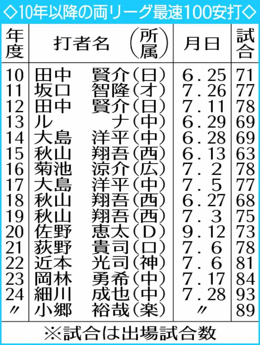 【Weekly Data展望】 ファビアン(広)が存在感を見せている。ここまでリーグトップの打率・308をマークし、94安打は両リーグ通じて岡林(中)の95安打に次ぐ2位だ。