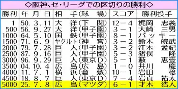 阪神が8日の広島戦に勝ち、1950年の2リーグ制以降のセ・リーグ通算5000勝に到達。4859敗319分けで通算勝率・507。セ初勝利は50年3月11日の大洋戦(下関)。2リーグ制以降の通算5000勝到達は巨人、ソフトバンク、西武、中日、オリックスに続く6球団目で、セ3球団目。なお1リーグ時代からの通算成績は5730勝5331敗352分けの勝率・518。