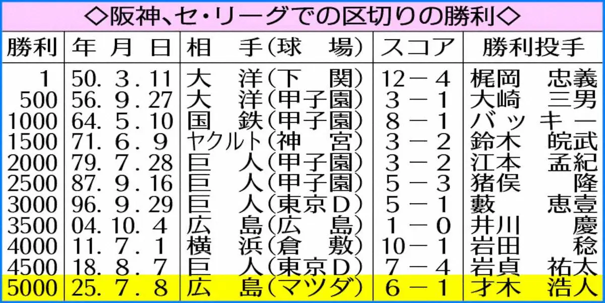 阪神セ・リーグ通算5000勝!巨人、ソフトバンク、西武、中日、オリックスに続く6球団目