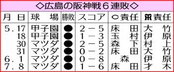 2位の広島は8日、首位・阪神に1―6で敗れ、2006年以来19年ぶりの同戦6連敗を喫した。新井貴浩監督(48)は、3点劣勢の4回にチーム勝ち頭の先発・床田を諦め代打攻勢で勝負に出たが、押し出し四球による1点のみ。阪神戦の連続無得点を21イニングで止めたが、計11残塁で5回まで毎回得点圏に走者を置く好機を生かせなかった。決定打不足が顕著で首位とのゲーム差は7・5に広がった。