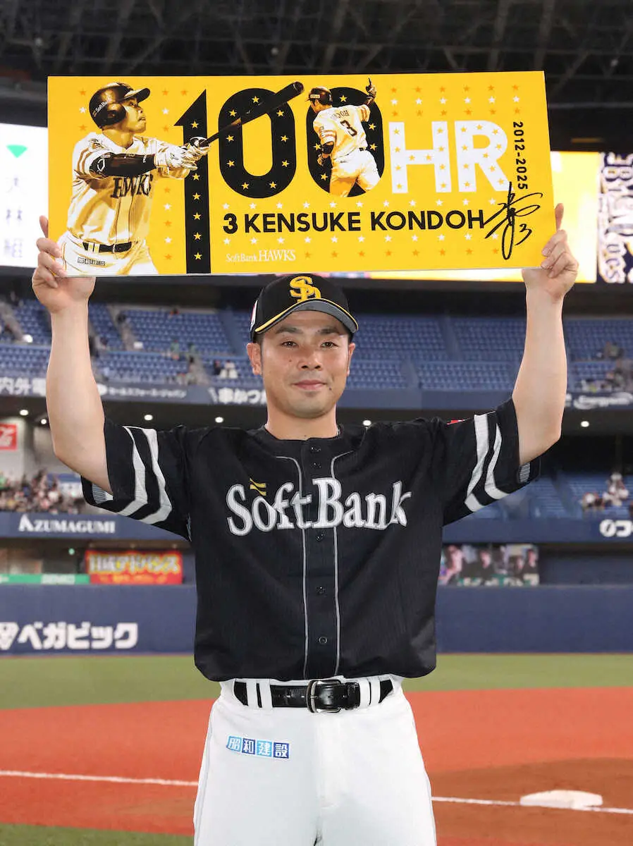 ソフトバンクの近藤健介外野手(31)が8日、オリックス戦で通算100本塁打を自身11年ぶり2本目の満塁弾で飾った。0―0の3回にエスピノーザから先制の今季3号アーチ。左かかとを痛めて途中交代した6月17日の広島戦以来、15試合ぶりの先発復帰を自ら祝った。有原航平投手(32)は7回1失点で6勝目をマーク。チームは3連勝で貯金を今季最多13とし、オリックスを抜いて2位に浮上した。