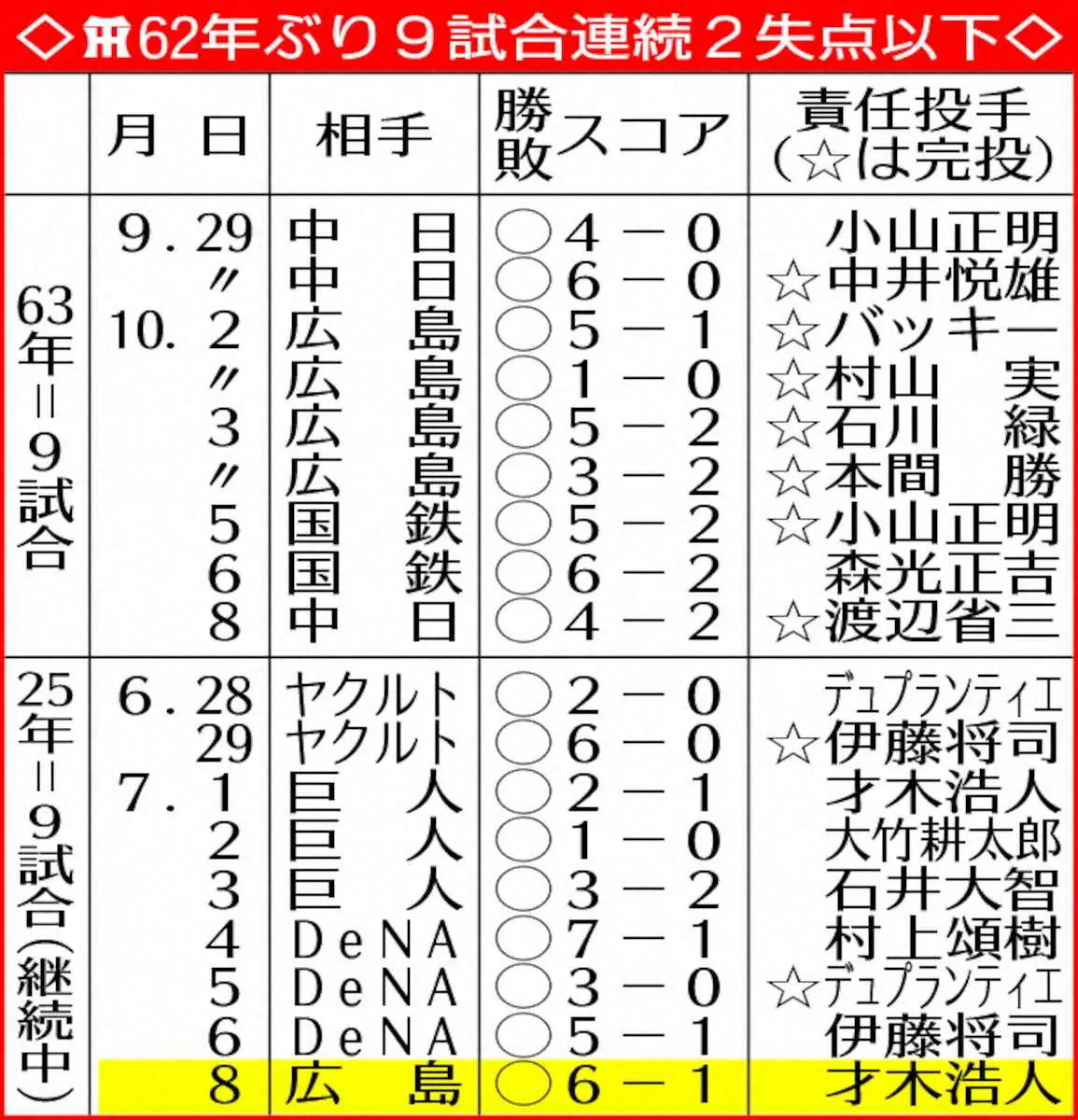阪神は9連勝の始まった6月28日ヤクルト戦からすべて2失点以下。阪神の9試合連続2失点以下は63年の9試合以来62年ぶり。球団記録は56年の13試合で、2リーグ制以降のプロ野球最長記録。