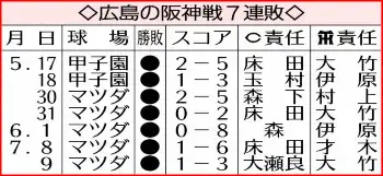 広島が9日、本拠地で27年ぶりの恥辱にまみれた。首位を走る阪神に1―3で敗れ、同カードは1998年以来の7連敗。得点力に陰りが見える打線は天敵・大竹から1点しか奪えず、先発・大瀬良大地投手(34)は6回1/3を9安打3失点で5敗目を喫した。虎の背が大きく遠のく8・5ゲーム差に広がり、2連敗のチームは貯金がなくなった。