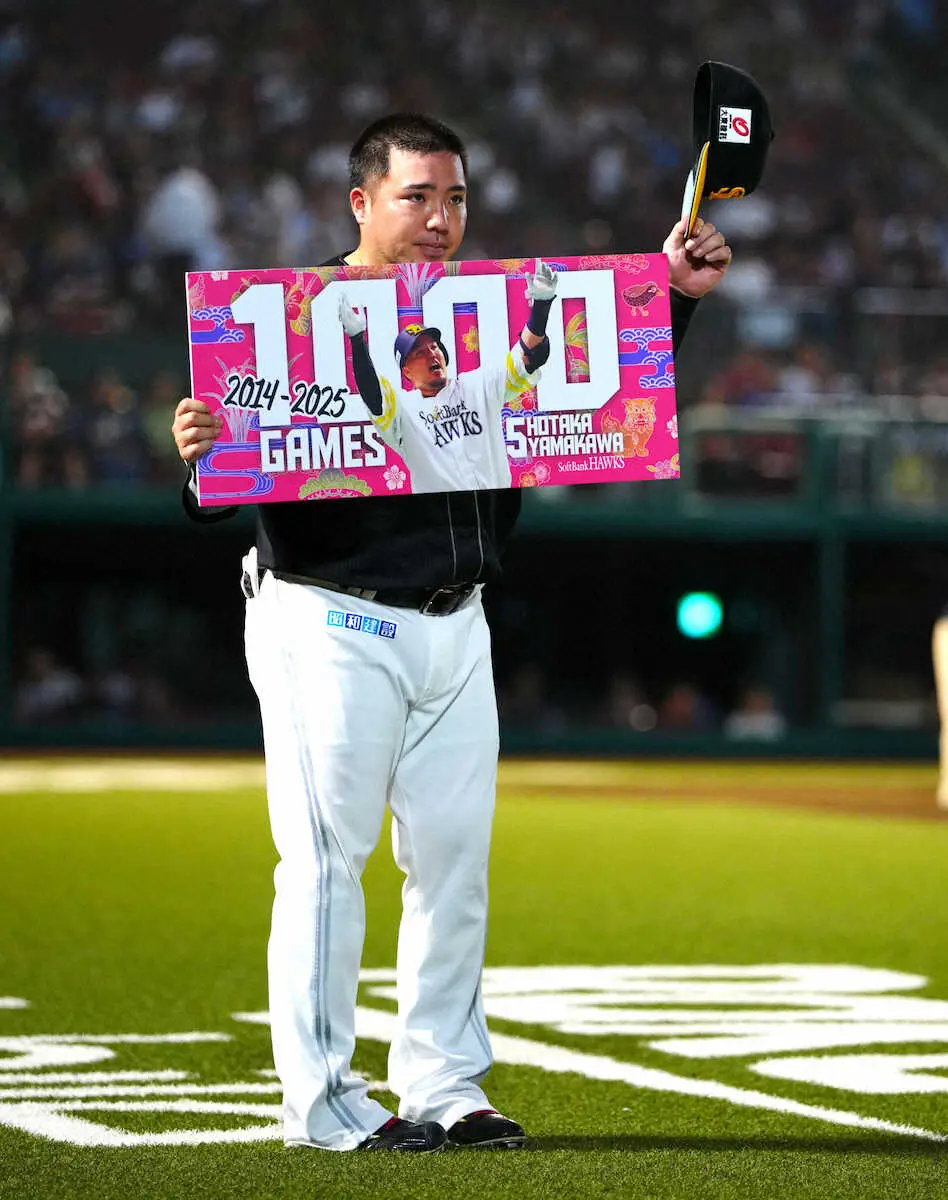 両軍のファンから拍手をもらった山川は深々と頭を下げた。5回が終了して試合が成立すると、プロ通算1000試合出場の記念ボードをベンチの前で掲げた。