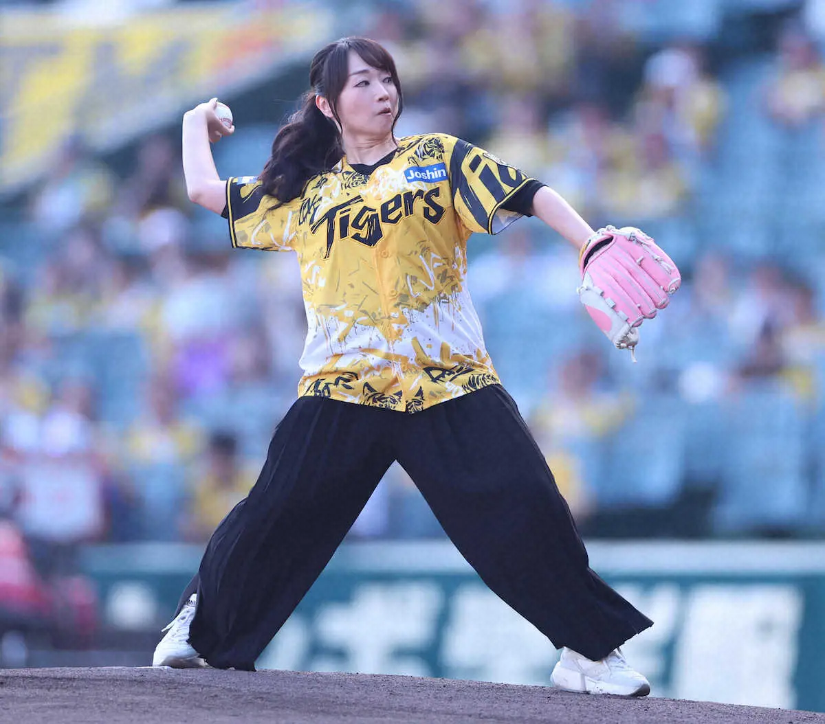 11~13日、15~17日の6日間開催する「ウル虎の夏2025」2日目の特別ゲストとして登場した水樹。ウル虎の夏限定ユニフォームに黒のパンツ姿でマウンドに上がり、ファーストピッチセレモニーを務めた。投球はツーバウンドでミットに届いた。