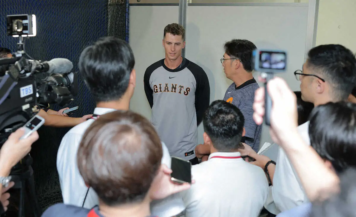 会見に先立ち育成から支配下登録することが発表されたフルプ。背番号は「39」に決まり、即昇格しDeNA戦(横浜)を戦う1軍本隊に合流する見込みだ。