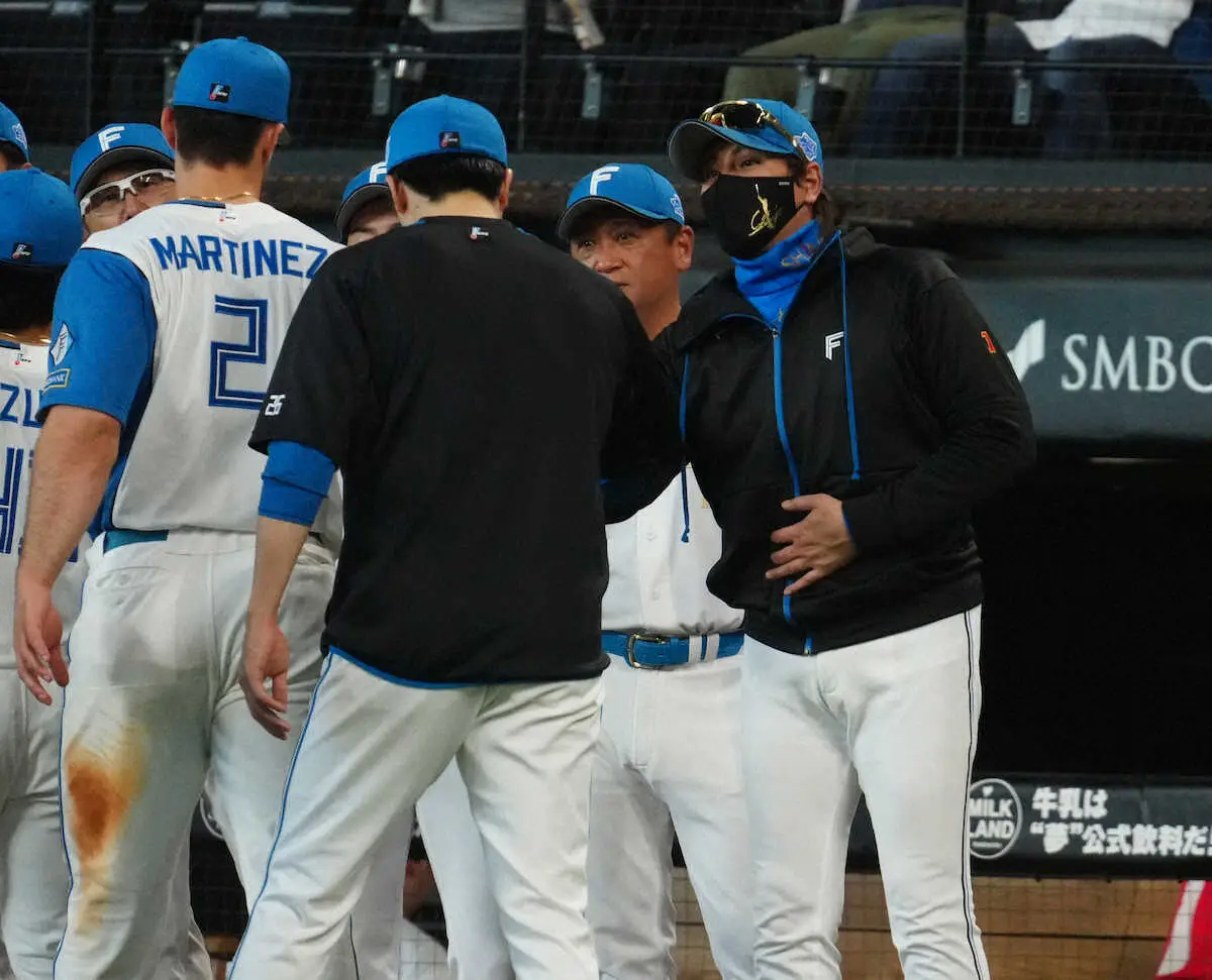<日・オ(14)>勝利のタッチを交わす新庄監督(撮影・高橋 茂夫)