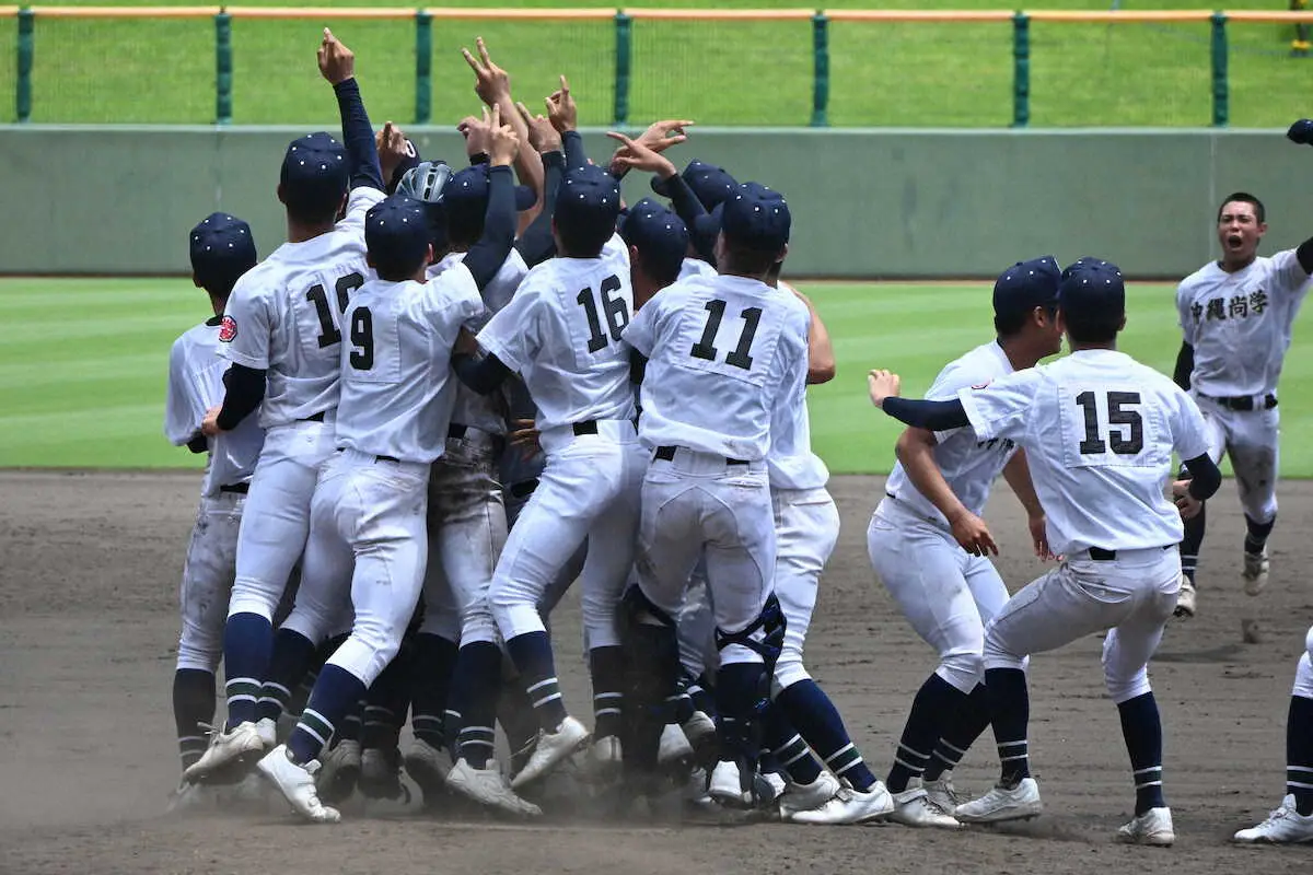 ともに春の選抜大会に出場した両校の頂上決戦。最後までマウンドに立ち続けた最速150キロの2年生エース左腕、末吉良丞が両手を突き上げた。