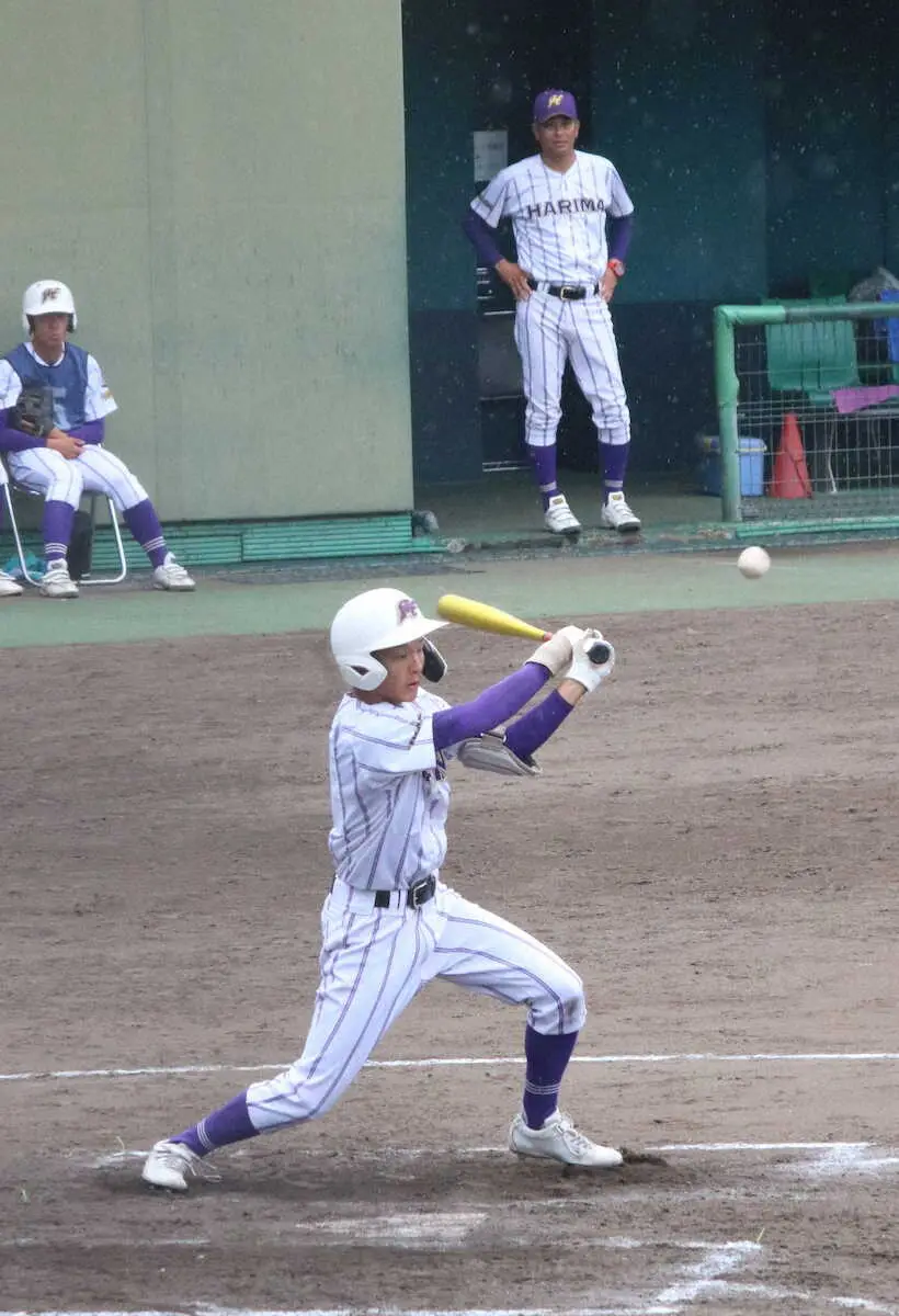 <東播磨・仁川学院>父・福村順一監督(奥)の前で打席に立つ次男で主将の福村泰輝(撮影・河合 洋介)