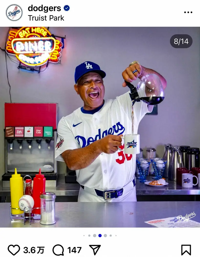 球団公式インスタグラムはドライブインのようなセットでユニホーム姿で写真を撮影した選手たちを公開。大谷が店員に扮して注文を取るようなポーズ、フリーマンとスミスがボックス席に座り笑みを浮かべる写真、ロバーツ監督が店員になりきってコーヒーを注ぐ写真など様々なカットがお披露目された。