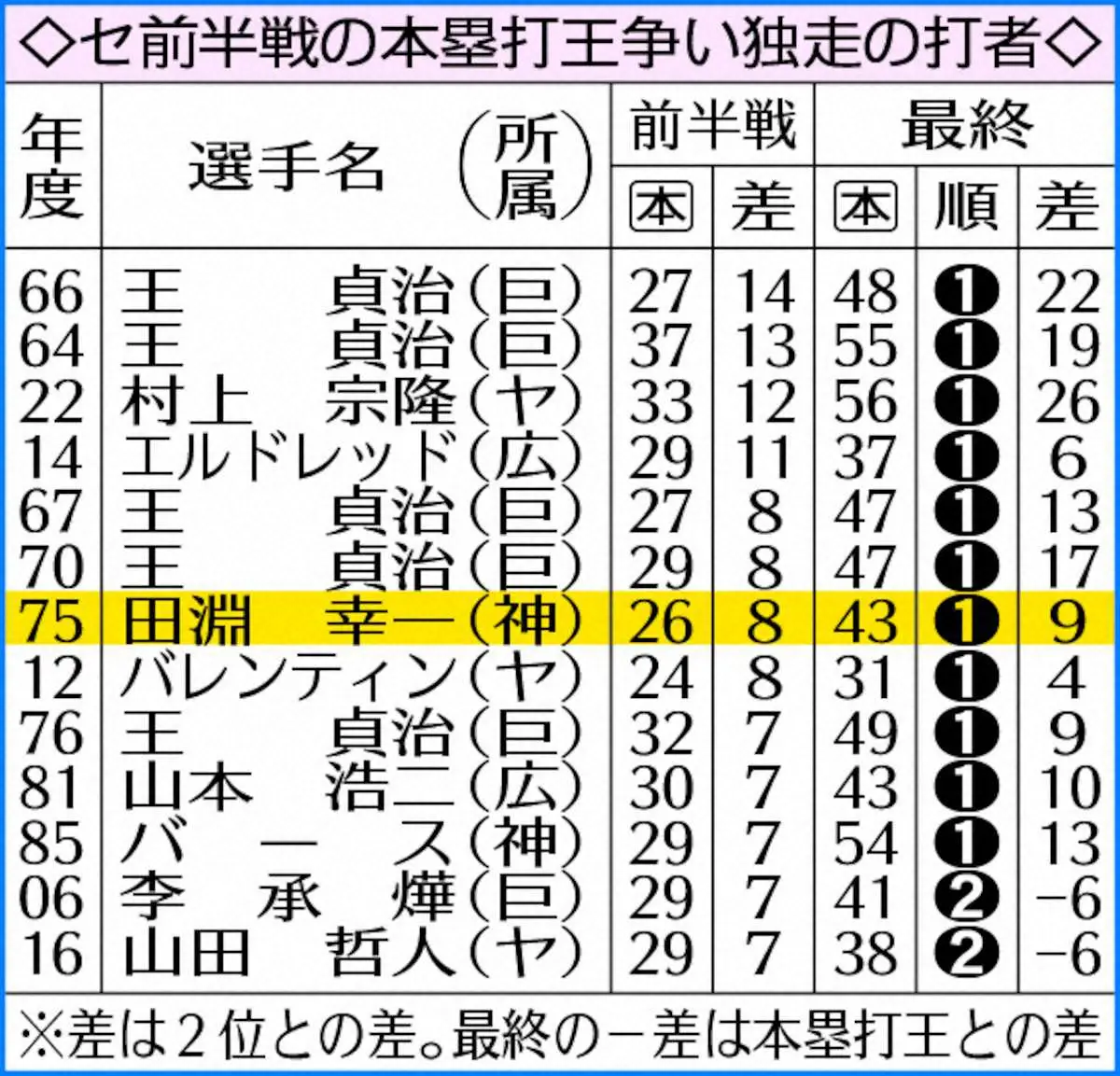 阪神では75年田淵幸一が8本差で折り返したのが最大。佐藤輝が9本差をキープすれば球団史上初めてになる。なお、過去のセ・リーグで球宴前に2位に7本差をつけながらタイトルを逃したのは06年李承(火ヘンに華)(巨)と16年山田(ヤ)だけ。8本差以上になると延べ8人全てが本塁打王を手にしている。