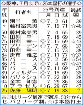 阪神、7月までに25本塁打の選手 Photo by スポニチ 阪神・佐藤輝明 巨人の自力V消したった決勝の25号「もっと打ちたい」G戦9… ギャラリーで見る この記事のフォト 2025年07月20日の画像一覧 もっと見る 2025年07月20日の画像をもっと見る