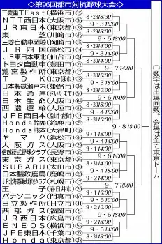 第96回都市対抗野球大会(8月28日開幕、東京ドーム、スポニチ後援)の組み合わせ抽選会が19日、都内で行われ出場32チームの対戦相手が決まった。昨秋の日本選手権を制したトヨタ自動車(豊田市)は、前回準優勝のJR東日本東北(仙台市)と対戦。2連覇を目指す三菱重工East(横浜市)は大会初日の1回戦でNTT西日本(大阪市)、今大会最多64度目の出場となる日本生命(大阪市)は西濃運輸(大垣市)と初戦を戦う。