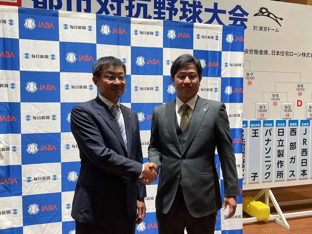 対戦が決まり握手するトヨタ自動車の藤原航平監督(右)とJR東日本東北の西村亮監督