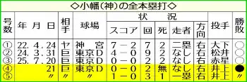 勢いは本物だ。前日20日に先制の決勝アーチを放った小幡が自身初となる1試合2本塁打。敗戦の中で高卒7年目の若武者の打撃開眼は大きな収穫となった。