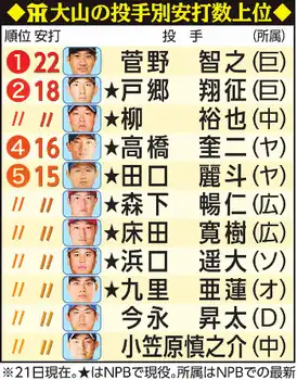 ○…5回の左越え2ランまで1001安打の球団別内訳はヤクルト188、DeNA186、巨人186、中日179、広島165、交流戦97。投手別では巨人時代の菅野(現オリオールズ)が22安打で最多。