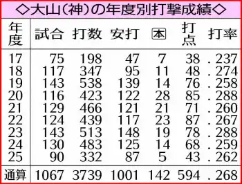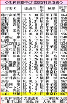 ○…大山(神)が21日の巨人18回戦(東京ドーム)3回、井上からの左前打で通算1000安打に到達。プロ野球324人目。プロ初安打は17年7月1日ヤクルト戦3回、原樹から左越え3ランで記録。阪神在籍中の選手の達成は今季6月7日の近本に続く26人目。生え抜き選手では18人目。同一年度に2人の達成は70年遠井吾郎と鎌田実、84年真弓明信と佐野仙好、05年今岡誠と矢野輝弘以来20年ぶり4組目、ともに生え抜き選手は70年以来55年ぶり2組目になる。