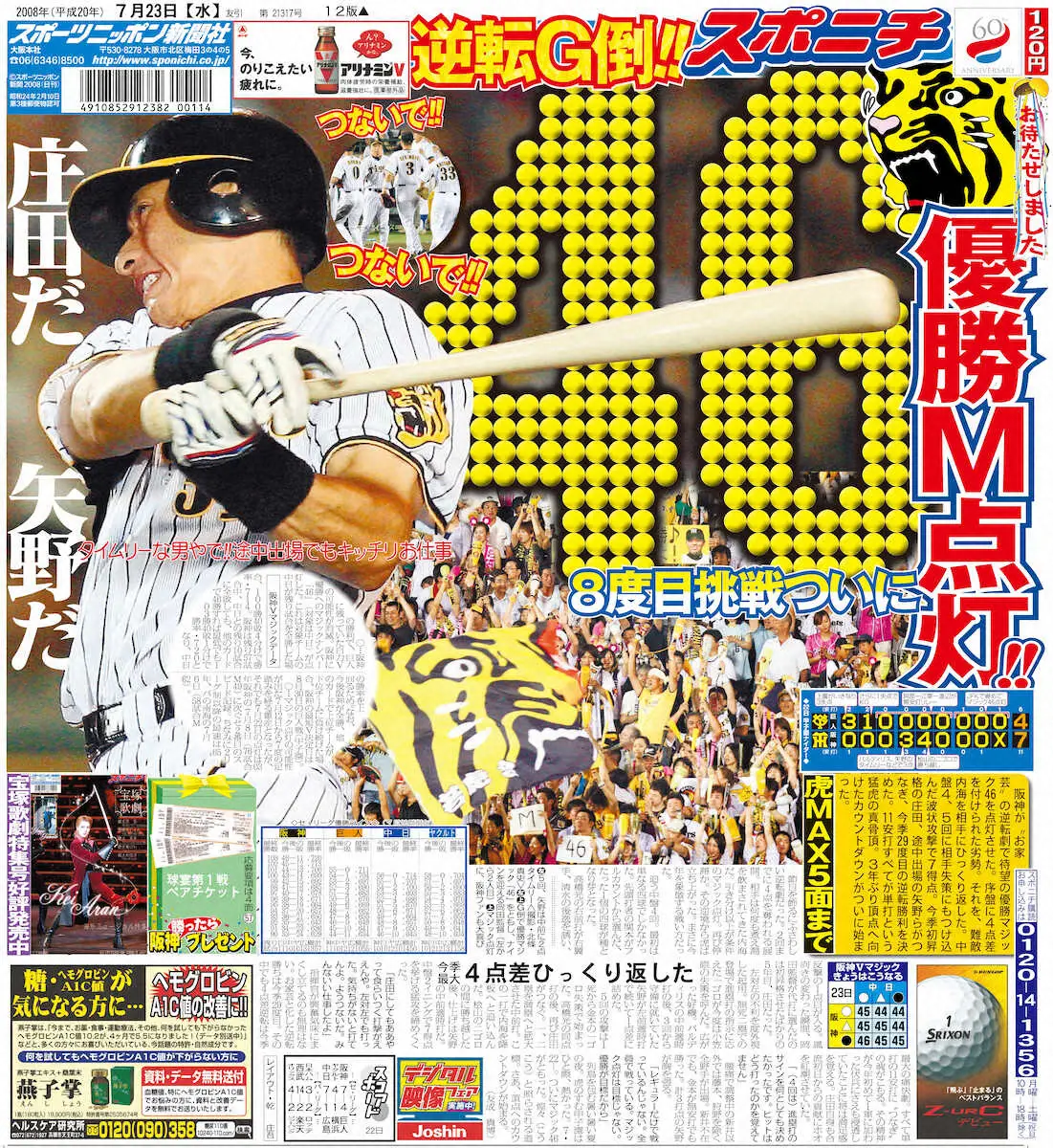 阪神のマジックナンバー点灯を報じる08年7月23日付大阪版1面