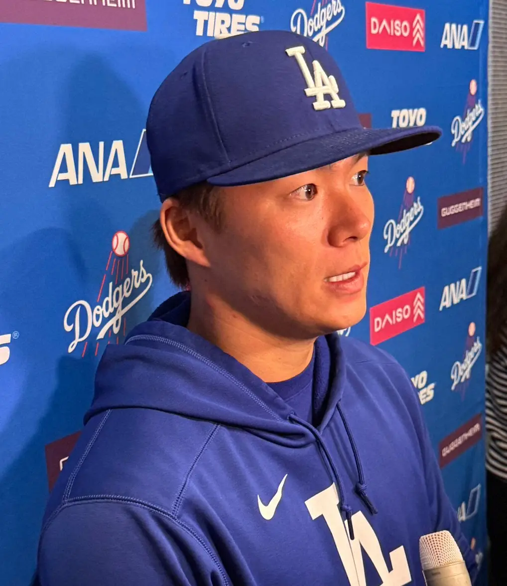 試合後、取材に応じるドジャース・山本(撮影・柳原 直之)