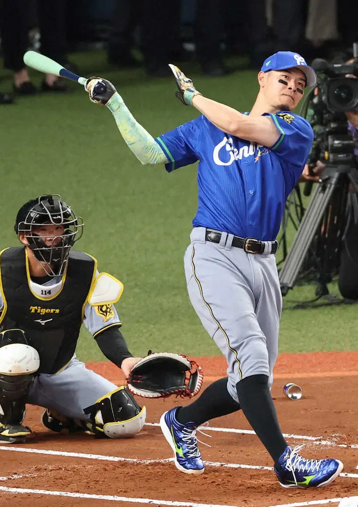 2分間球数無制限で本塁打数を争う「ホームランダービー」の初日が行われ、全セの佐藤輝と森下がそろって全パの清宮幸に敗れ、きょう24日に横浜スタジアムで行われる決勝へ進めなかった。両リーグ最多の25本塁打を引っ提げての登場となった佐藤輝は、投手役の中野を相手に1回戦で5発を放り込み、全パの頓宮に勝利。3度目の出場で初勝利した。準決勝では終盤の4連発で6本まで増やしたものの清宮幸に追い越され「僕はもう満足です。いい当たりもあったので。(清宮幸には)“次頑張れよ”と言いました。中野さんはいいところに投げてくれました」と話した。